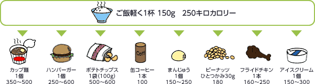 ご飯のエネルギーと比べてみよう。(絵の下の数字はおよそのカロリー)