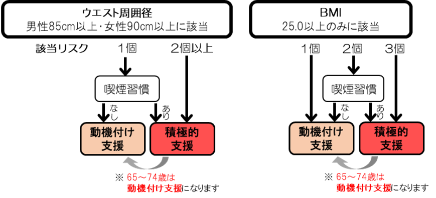 リスクの程度に応じて 「動機付け支援」または「積極的支援」の対象者に分かれます。